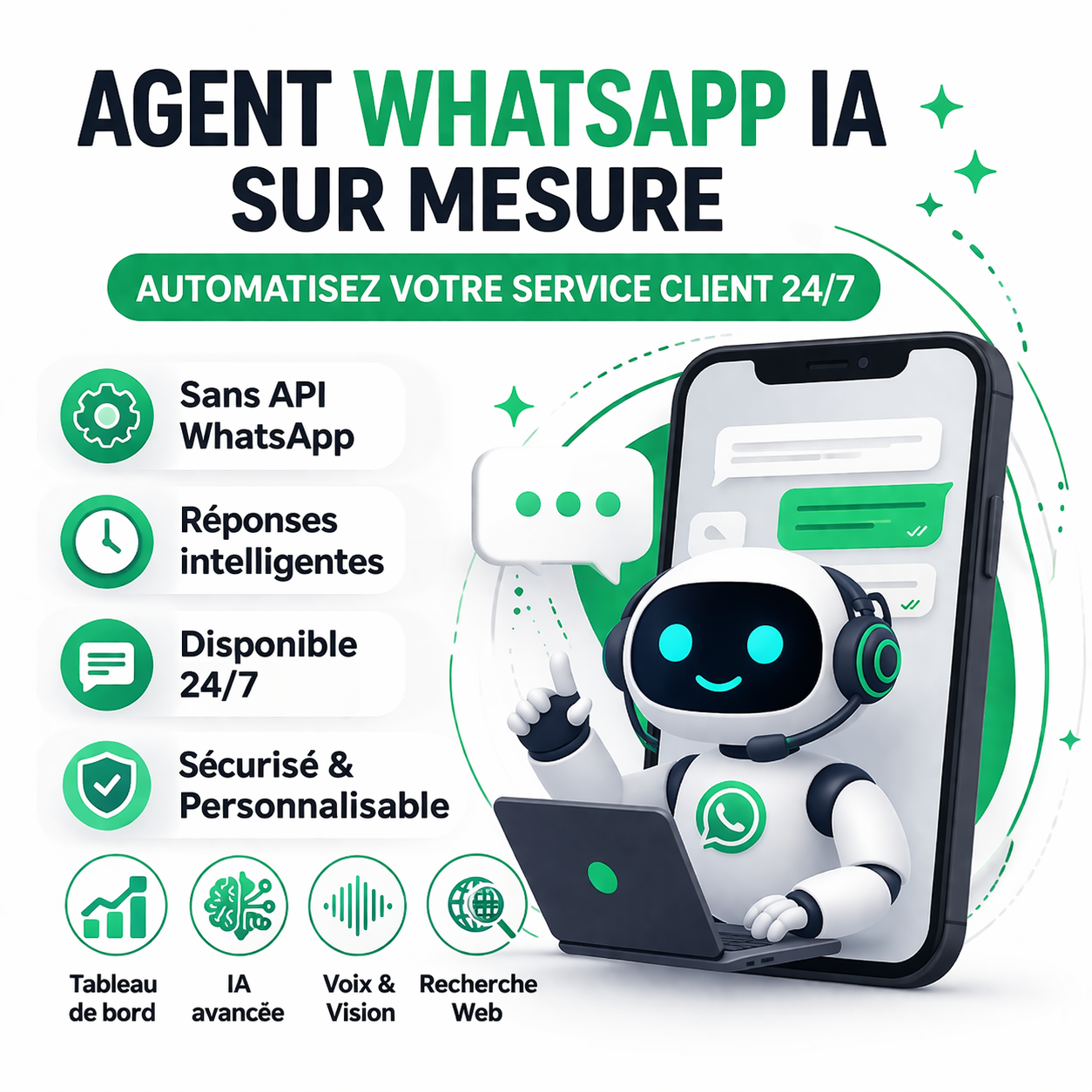 Cette solution fonctionne sans API WhatsApp Business, et peut être déployée sur n’importe quel numéro WhatsApp.