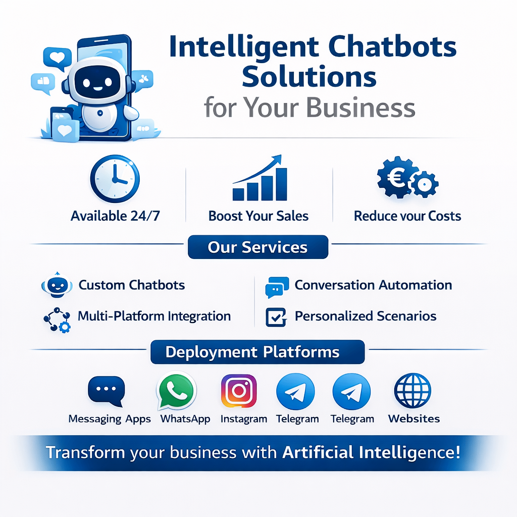 We create fully customized chatbot solutions powered by advanced artificial intelligence, enabling smart, natural, and efficient interactions with your audience. Our solutions are tailored to fit your business needs and industry.