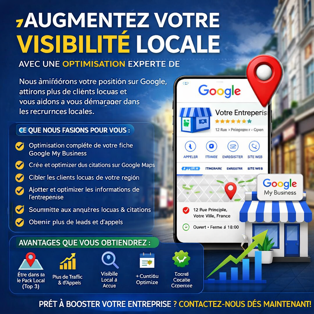 Nous sommes spécialisés en référencement local (SEO local) avec plusieurs années d’expérience dans l’optimisation de Google My Business, les citations Google Maps et les stratégies de visibilité locale. Nous avons accompagné de nombreuses entreprises à atteindre les premières positions dans les résultats de recherche locale sur Google.