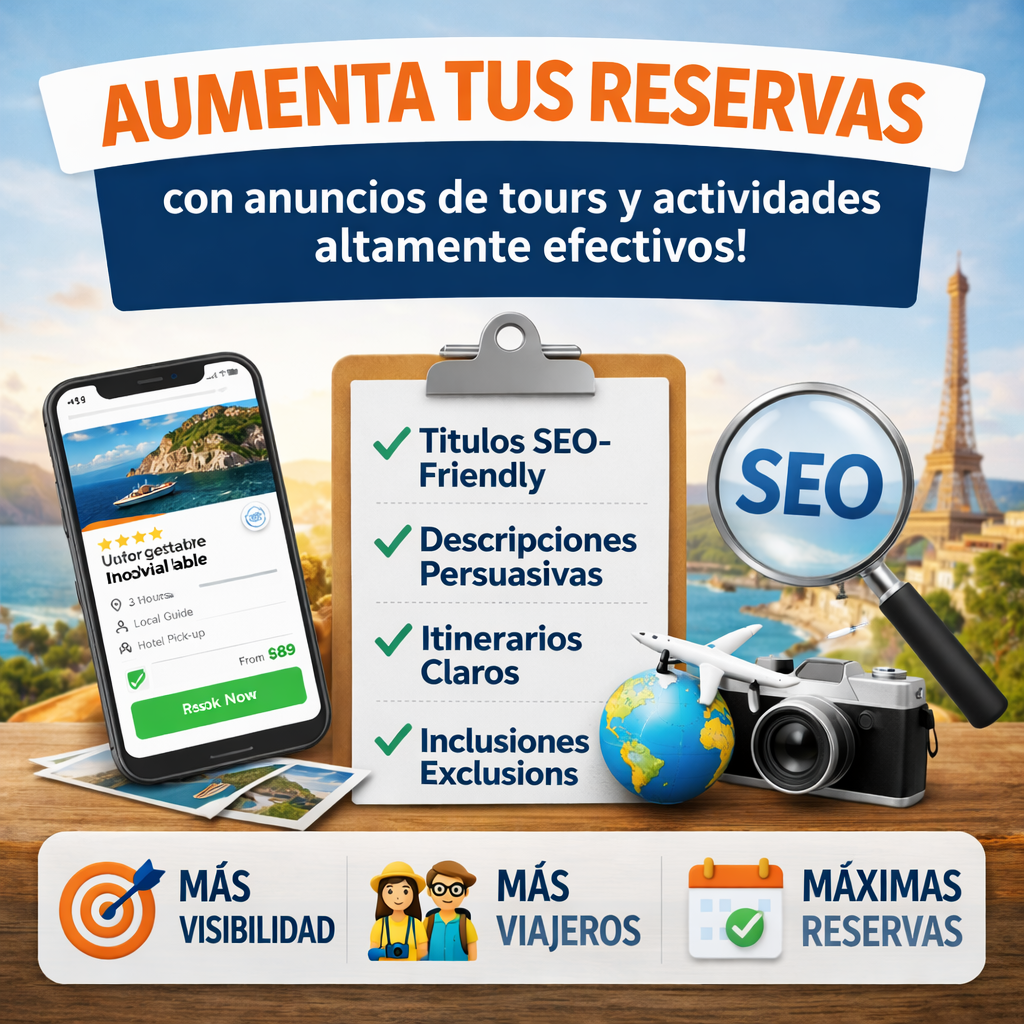 Ayudamos a tour operadores, agencias de viajes y proveedores de actividades a crear y optimizar sus anuncios para aumentar su visibilidad, atraer más clientes y maximizar sus reservas.