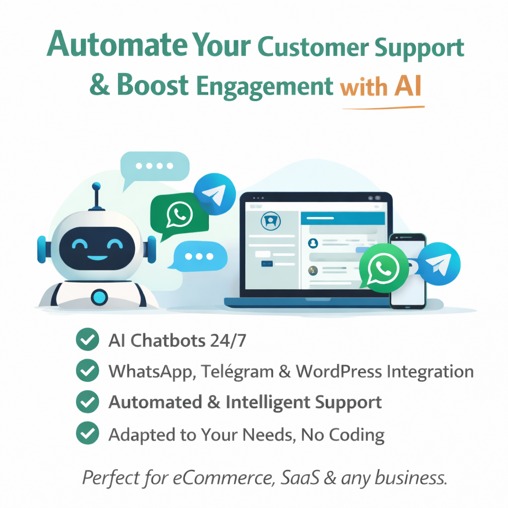We build professional AI chatbots integrated with your website, WhatsApp, and Telegram, providing 24/7 support for your customers.