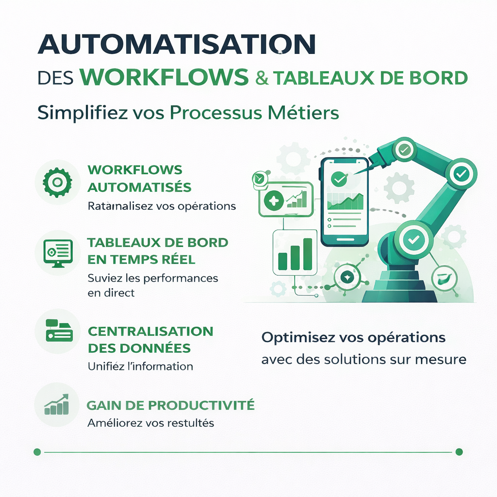 De l’analyse de vos processus à la création de workflows automatisés et de tableaux de bord décisionnels, nous concevons des solutions qui permettent à vos équipes de travailler plus rapidement, plus intelligemment et avec moins de contraintes.