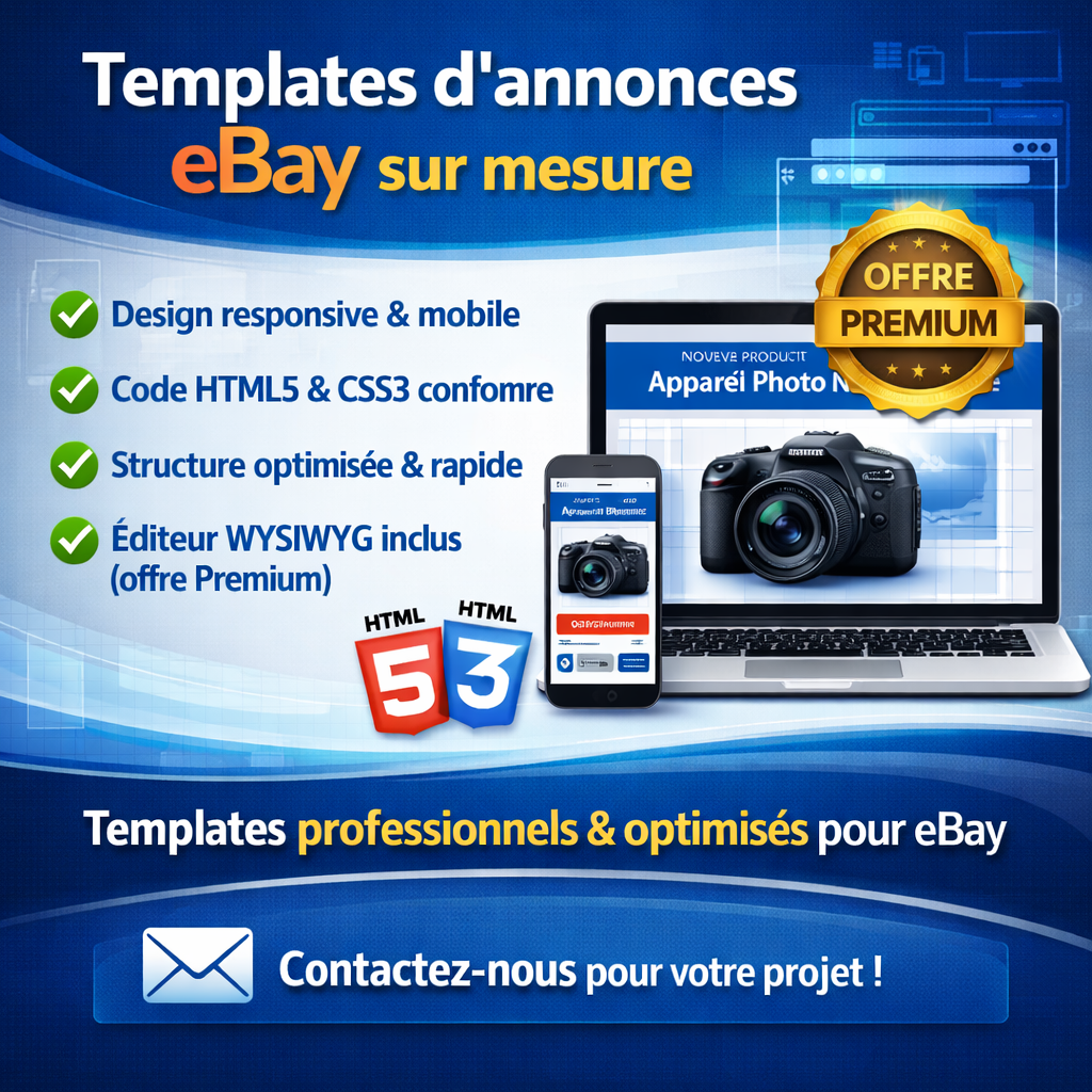 ✔ Code propre en HTML5 et CSS3 conforme aux exigences eBay