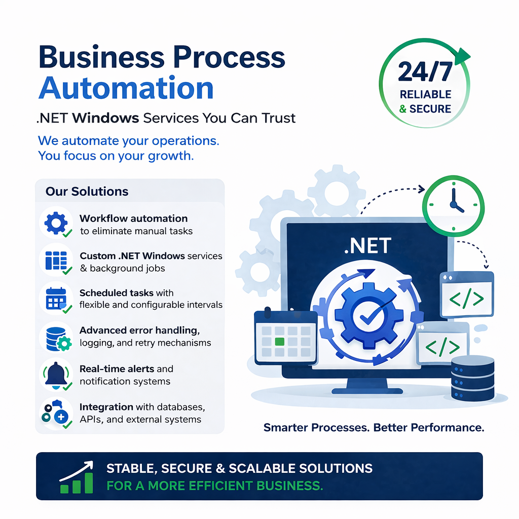 We design and develop robust Windows Services and background automation solutions using .NET that run continuously and reliably.