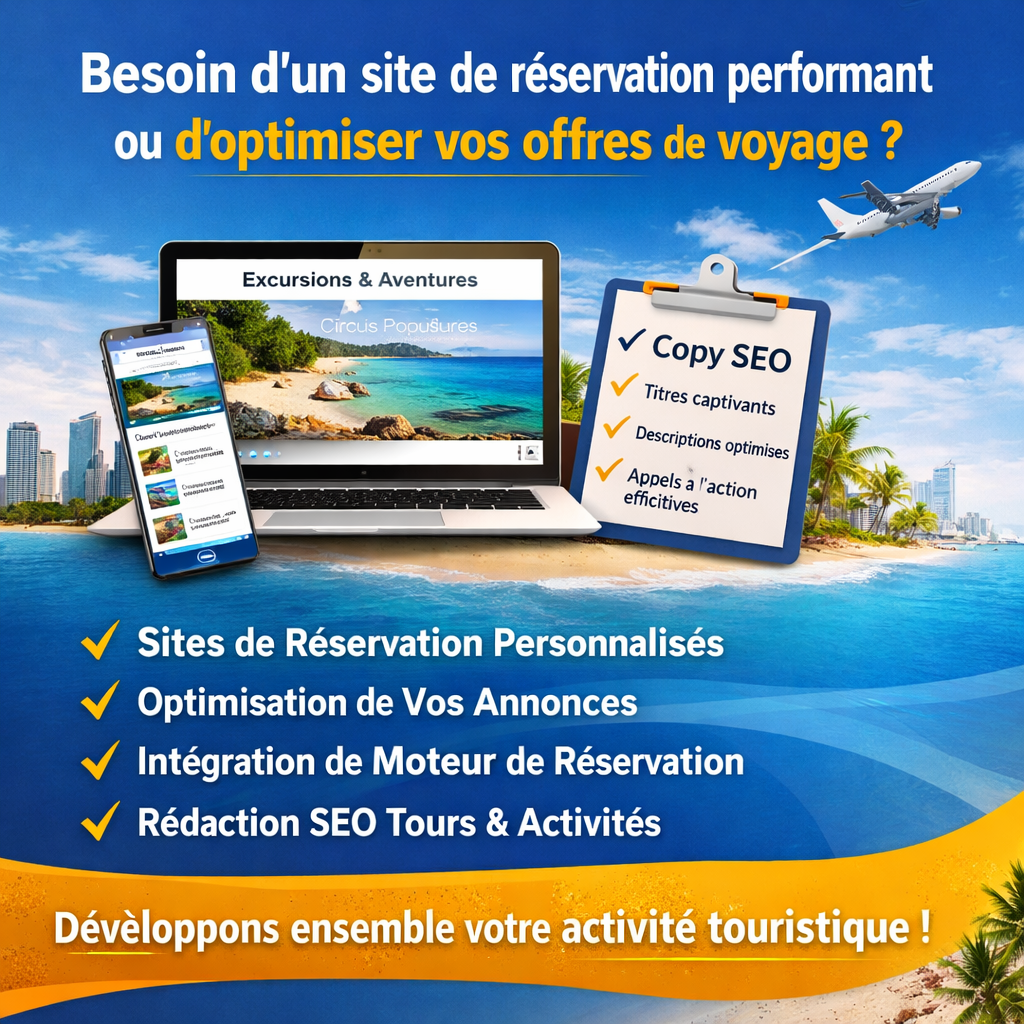 Nous développons des sites de réservation mobiles, optimisés pour le référencement naturel et entièrement connectés à vos canaux de distribution en ligne. L’objectif : améliorer votre visibilité, fluidifier le parcours de réservation et renforcer la confiance des voyageurs.