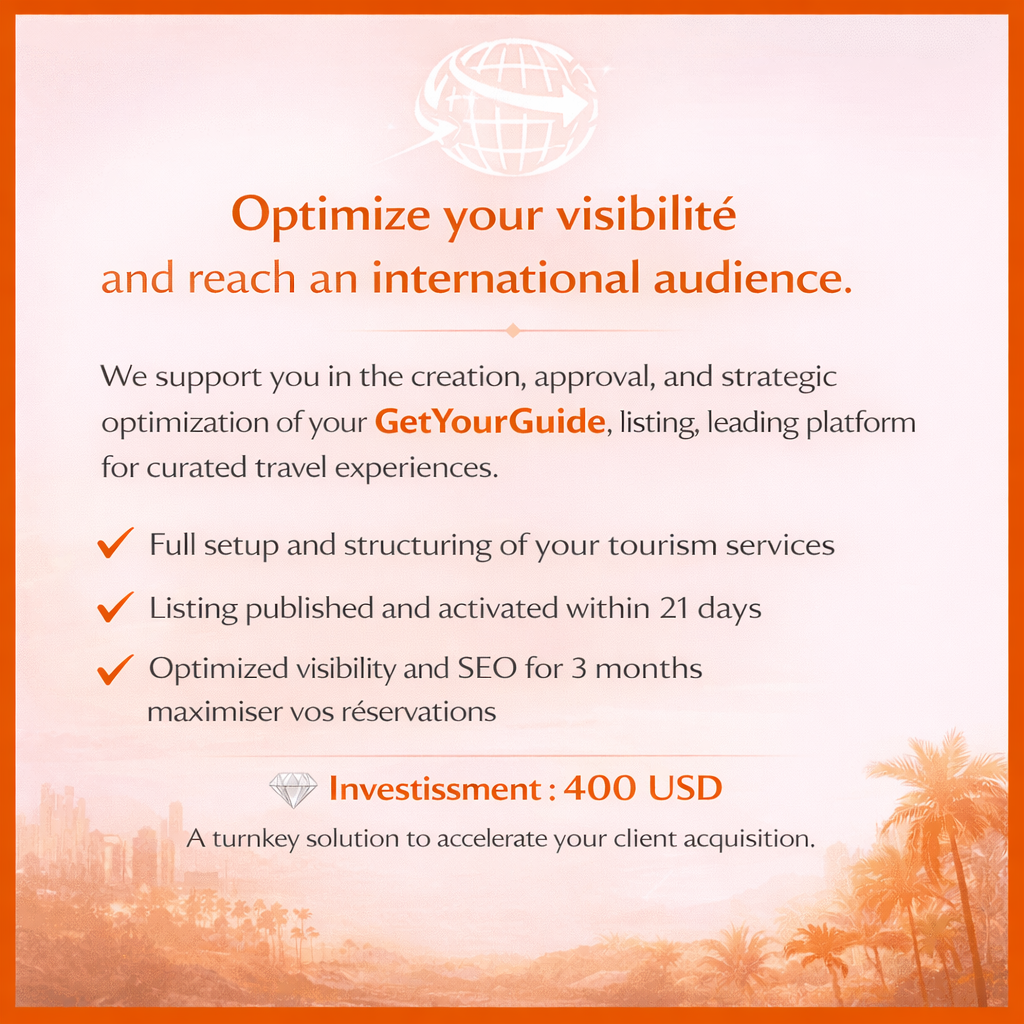 We support you in the creation, approval, and strategic optimization of your GetYourGuide listing, a leading platform for curated travel experiences.