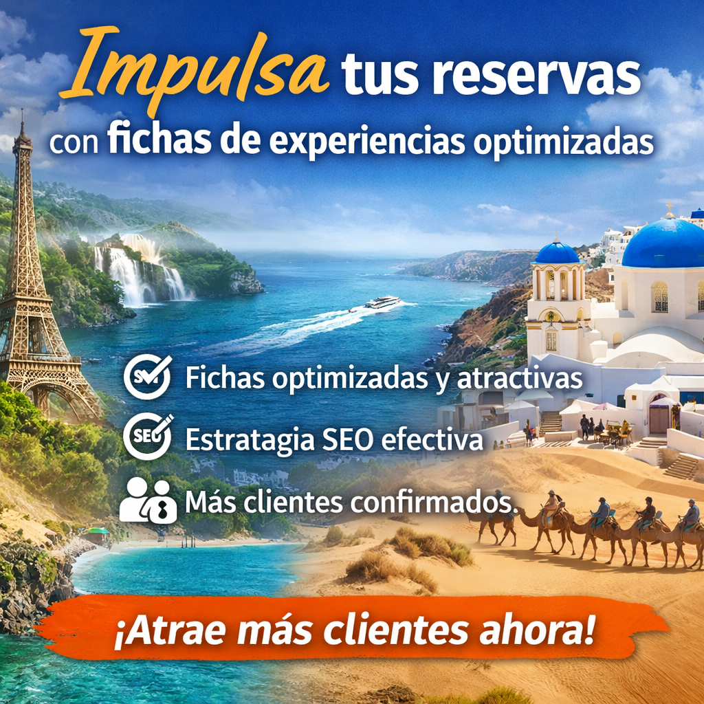 Ayudamos a operadores turísticos, guías y anfitriones de experiencias a crear, optimizar y posicionar estratégicamente sus ofertas, para generar más impresiones, más clics y más reservas confirmadas.