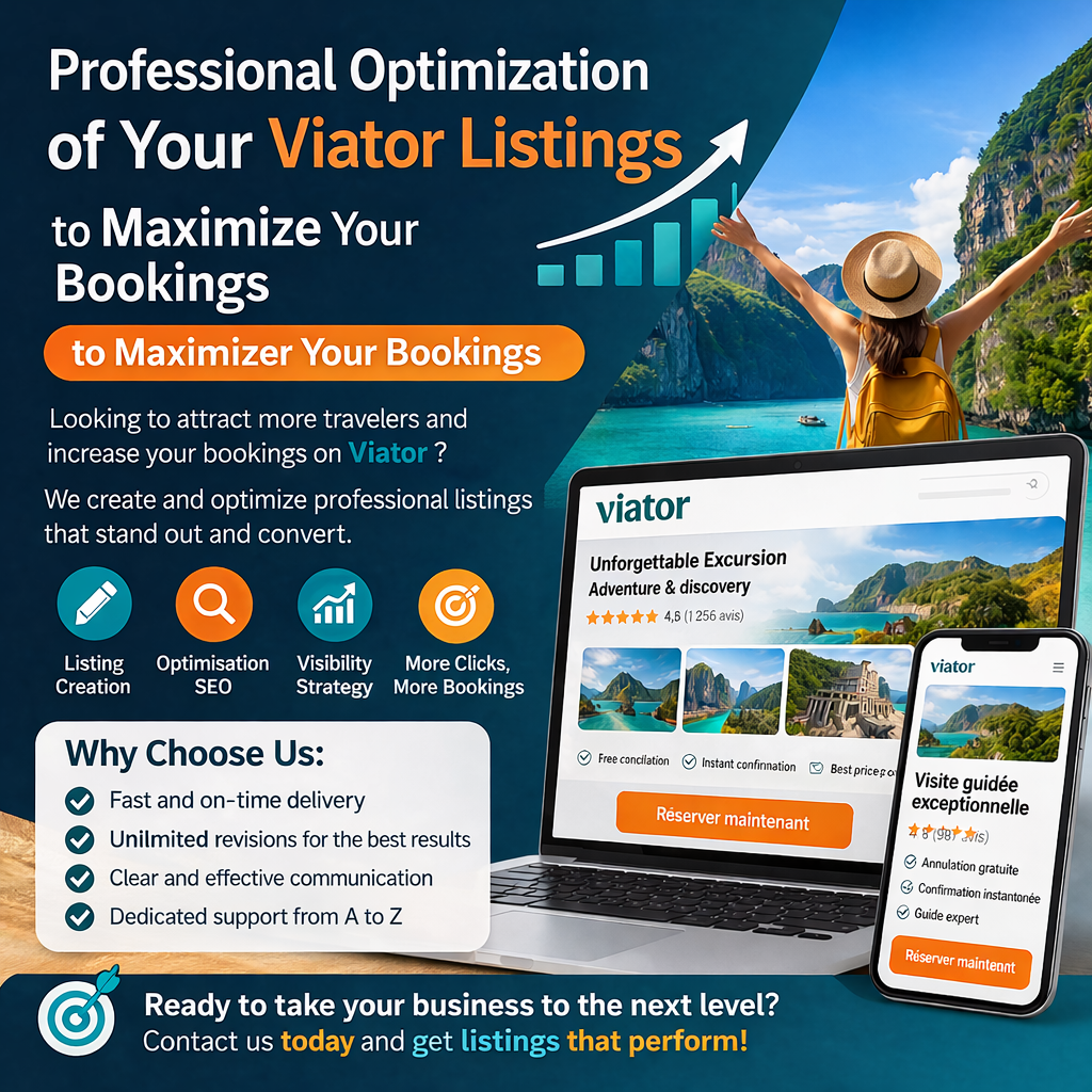 We specialize in creating, optimizing, and managing professional listings on Viator. With a strategic and well-optimized presentation, your offers will stand out from the competition, attract more travelers, and generate consistent bookings.