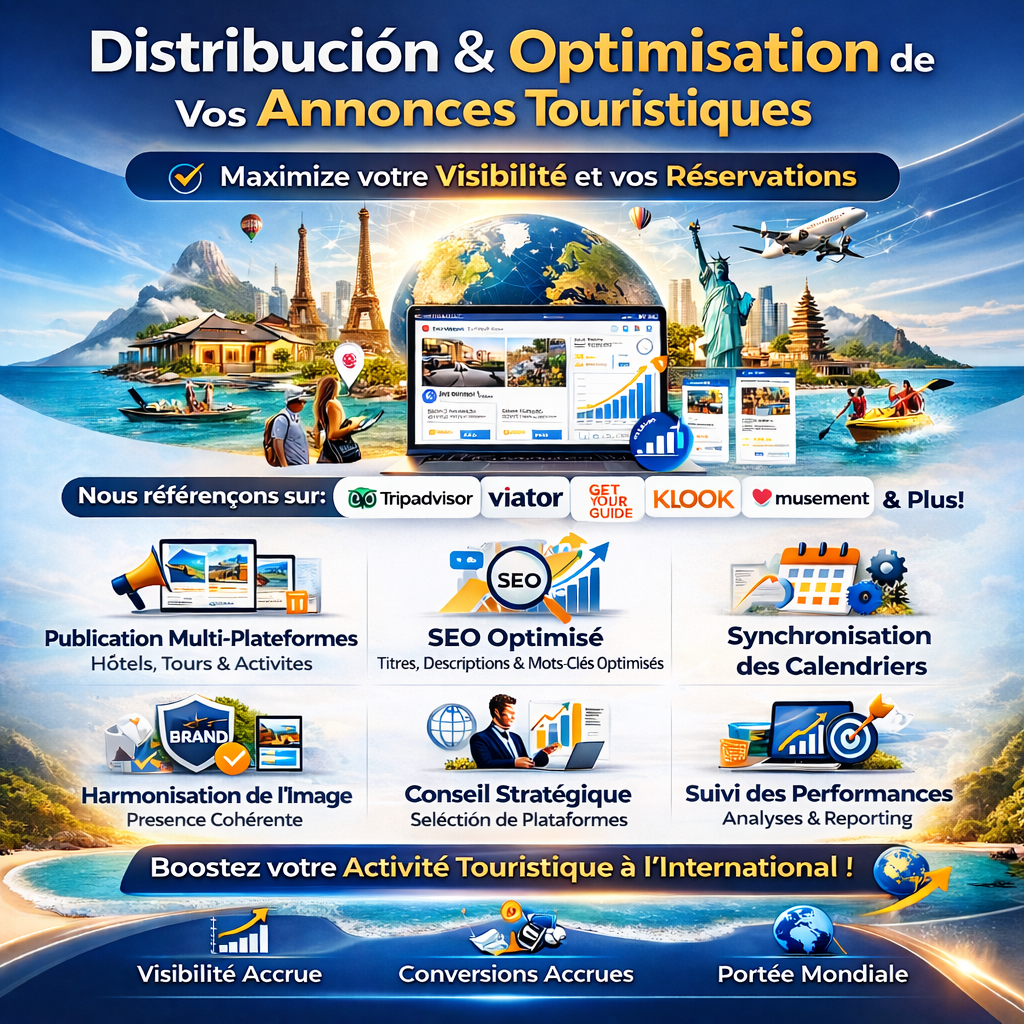 Nous accompagnons les professionnels du tourisme dans la création, l’optimisation et l’intégration de leurs annonces sur les principales plateformes de réservation internationales.