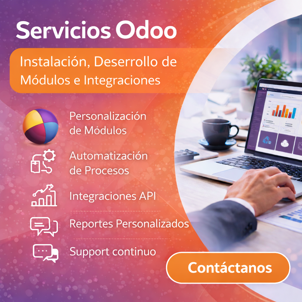 Ofrecemos soluciones completas de Odoo que incluyen instalación, personalización de módulos, automatización de procesos, integraciones con herramientas externas, reportes personalizados y mucho más, todo adaptado a las necesidades específicas de tu empresa.