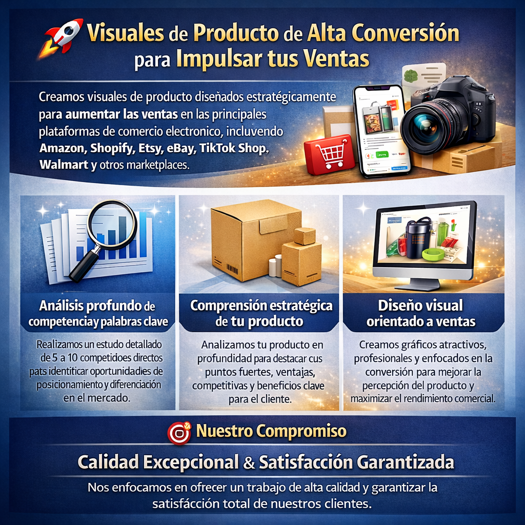 Creamos visuales de producto diseñados estratégicamente para aumentar las ventas en las principales plataformas de comercio electrónico, incluyendo Amazon, Shopify, Etsy, eBay,Walmart y otros marketplaces.